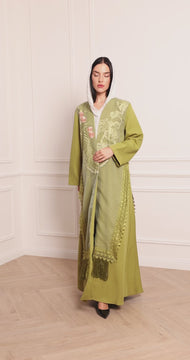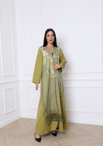 Refresh your wardrobe with this unique matcha green abaya, crafted from smooth crepe fabric for a refined, flowy silhouette. The back is adorned with delicate tassels that add playful movement, while soft organza floral designs enhance the look with a touch of elegance and femininity. A beautiful balance of earthy tones and graceful detailing, this abaya is perfect for those who appreciate subtle style with artistic flair.