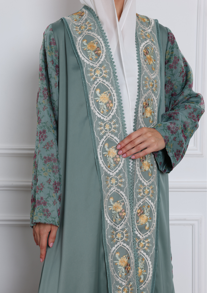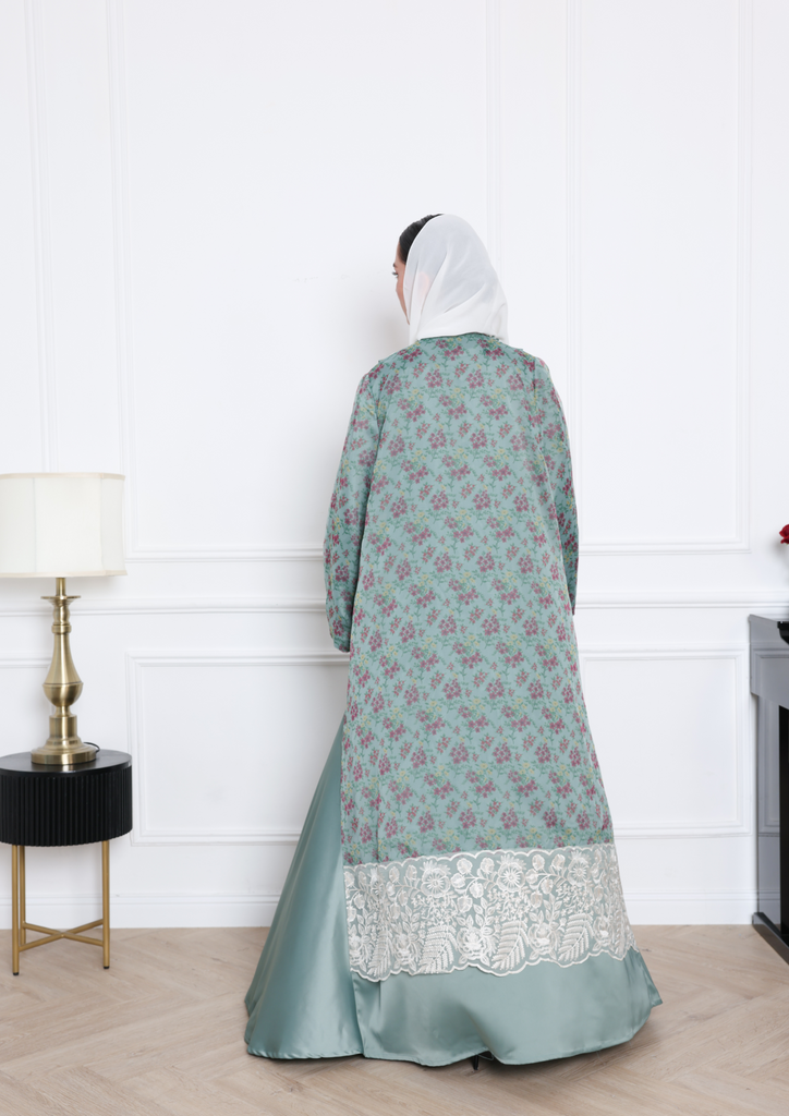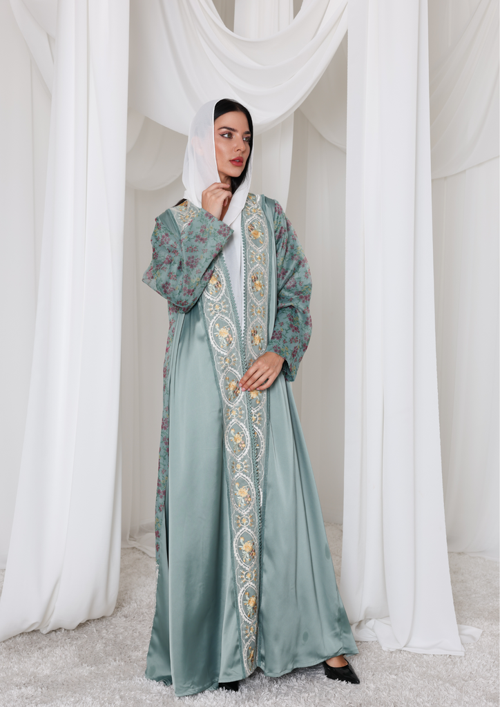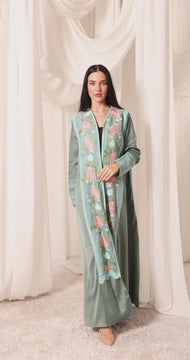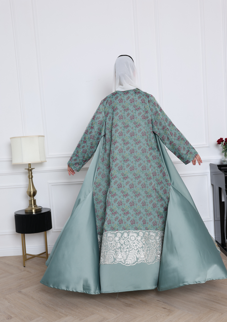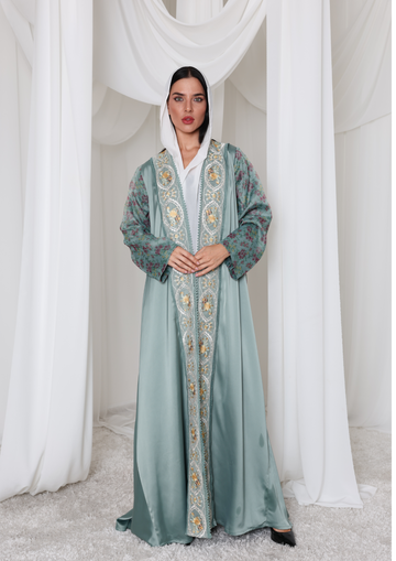 Step into elegance with this exquisite Tiffany blue abaya, crafted from soft crepe fabric and beautifully accented with floral organza on the back and sleeves. The sheer, delicate detailing adds a touch of femininity and charm, making it the perfect statement piece for any occasion. Graceful, modern, and effortlessly chic, this abaya is where subtle luxury meets timeless beauty.