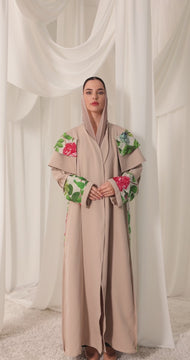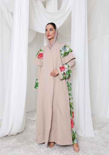 Turn heads with this elegant nude-colored abaya, designed from soft crepe fabric for a graceful silhouette. It features a flowing cape in the back that adds a touch of drama and sophistication. Tropical floral details adorn the sides and cascade through the cape, bringing a vibrant yet refined contrast to the soft nude tone. A perfect fusion of modern elegance and nature-inspired charm. Ideal for the woman who embraces subtle luxury with a bold twist.